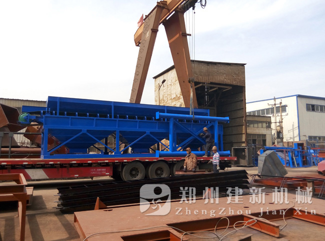 郑州建新机械制造有限公司货场上,一台PLD1600三仓砂石配料机正在做着最后的检验工作,准备发货。据了解,这台PLD1600砂石配料机与前两天发出的JS1000混凝土搅拌机是同一批设备,为一套HZS60混凝土搅拌站。